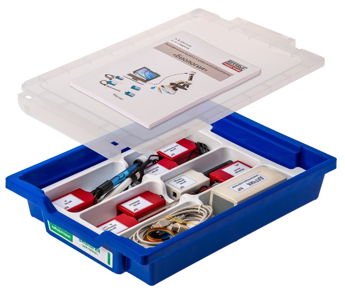 Цифровая лаборатория укомплектована в специальный пластиковый контейнер, который закрывается прозрачной пластиковой крышкой для обеспечения наблюдения за содержимым. Комплект оборудования и датчики в контейнере располагаются на специальном ложементе