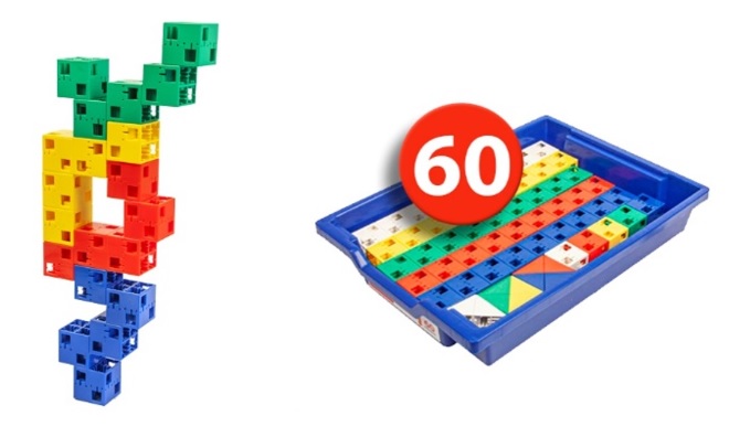 В состав набора входит 60 элементов — по 5 крупных кубиков (4 х 4 х 4 см) пяти цветов и 10 треугольных полукубиков пяти цветов. Комплект снабжён карточками для изучения 9 тем с 219 заданиями трёх уровней сложности.