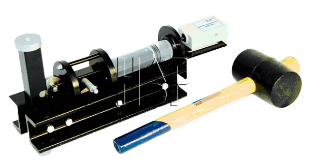 Герметичный резервуар для газа с поршнем смонтирован на массивном основании. Контроль давления воздуха в резервуаре осуществляется с помощью датчика абсолютного давления. Условия адиабатического процесса обеспечиваются при предельно быстром изменении объема резервуара. Для быстрого перемещения поршня используется клин, который с помощью молотка вбивается между толкателем поршня и стенкой корпуса.