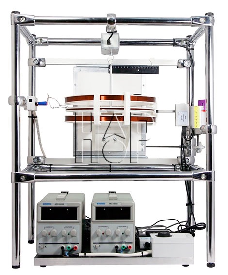Лабораторная установка включает измерительную катушку, магнитную систему для создания магнитного поля, систему питания и комплект датчиков для измерения силы тока, индукции магнитного поля и силы. Принцип работы установки состоит в измерении силы, действующей на катушку с током, помещенную в магнитное поле соответствующей конфигурации. Система питания, включающая два источника питания и два датчика тока, смонтирована на отдельной платформе. Двухкоординатное перемещение датчика магнитного поля, необходимое для регистрации пространственной картины поля, осуществляется с помощью ручных винтовых механизмов.