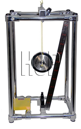 Маятник Максвелла подвешен внутри каркасной конструкции. Для фиксации моментов времени начала движения и прихода диска на определенную высоту вблизи нижней точки траектории используют оптоэлектрические датчики. Запуск движения системы осуществляется с помощью пускового устройства. Поворотная линейка служит для измерения перемещения оси вращения диска при движении от верхней точки до точки, в которой срабатывает нижний оптоэлектрический датчик.
