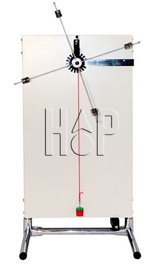 Маятник Обербека представляет собой крестовину на вращающейся оси, на шкив которой намотана нить с грузиком. На четырех взаимно перпендикулярных стержнях крестовины располагаются четыре подвижных груза одинаковой массы. Под действием силы тяжести груза нить сматывается с оси и вызывает вращательное движение крестовины. На оси крестовины располагается датчик угловой скорости вращения маятника.