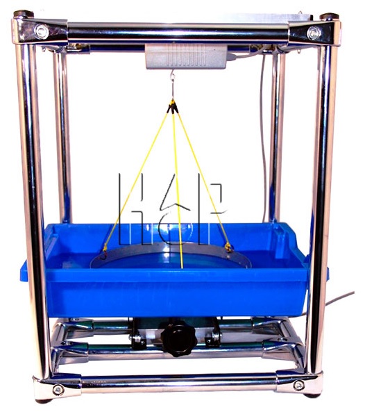 Установка представляет собой жесткий каркас, в верхней части которого смонтирован датчик силы. Тонкий металлический обруч, который погружается в жидкость, крепится к датчику силы с помощью нитяного подвеса. Кювета с исследуемой жидкостью устанавливается на подъемном столике, при движении которого вниз и соответствующем опускании кюветы тонкий металлический обруч отрывается от поверхности жидкости.