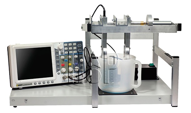 Лабораторная установка смонтирована в виде настольного металлического стенда и включает в себя сборку акустического резонатора, резервуар для жидкости, генератор с блоком питания и осциллограф. Конструкция установки обеспечивает контролируемое изменение длины акустического резонатора за счет перемещения одного из отражателей. Питание излучателя осуществляется от генератора синусоидального сигнала. В состав установки входит цифровой двухканальный запоминающий осциллограф с функциями вывода на экран амплитуды сигналов и частоты в цифровом виде.