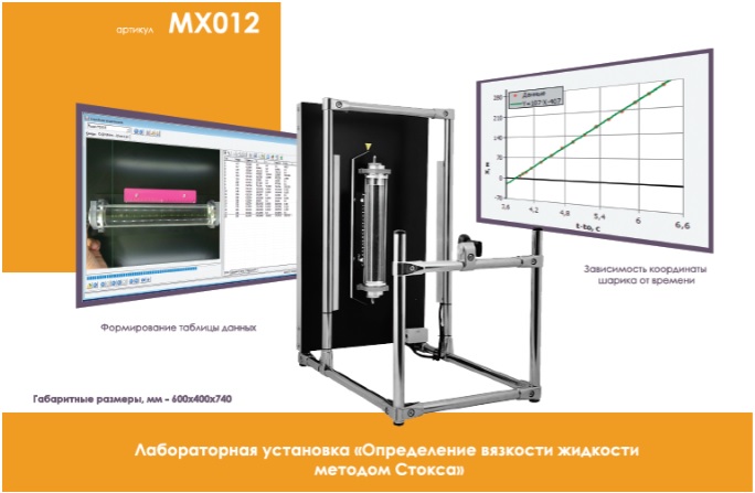 Установка представляет собой вертикальный металлический стенд с цилиндром, заполненным жидкостью. Регистрация движения шарика в жидкости осуществляется с помощью вэб-камеры, подключаемой к компьютеру. Вэб-камера установлена на специальном кронштейне достаточной жесткости. Равномерное освещение цилиндра осуществляется с помощью устройства подсветки.