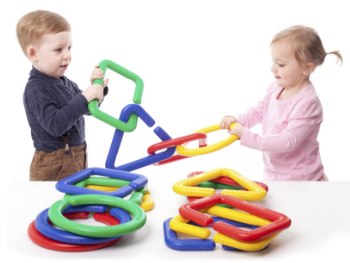 Состав набора: 16 соединяющихся цепочек в форме геометрических фигур (квадрат, треугольник, круг, прямоугольник) в 4 ярких цветах (зеленый, желтый, красный, синий)