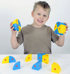 Состав набора: 4 части сфер голубого цвета, 4 части сфер желтого цвета, 4 части цилиндра голубого цвета, 4 части цилиндра желтого цвета.