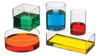 Пять полых прозрачных пластиковых ёмкостей с делениями в мл (4 - объемом по 1 л, 1 - 0,5 л), в которые можно наливать воду. Ёмкости имеют форму куба, параллелограмма, цилиндра и усечённого цилиндра. С их помощью можно наглядно изучать соотношения между объёмами тел правильных геометрических форм.