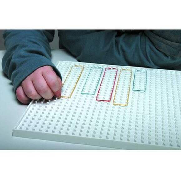 Игровое поле геоборда – пластиковый планшет с выступающими колышками, расположенными с одинаковыми промежутками по горизонтали и вертикали, за которые можно цеплять входящие в набор резинки и «рисовать» геометрические фигуры. Сетка колышков с промежутками в 1 см.
