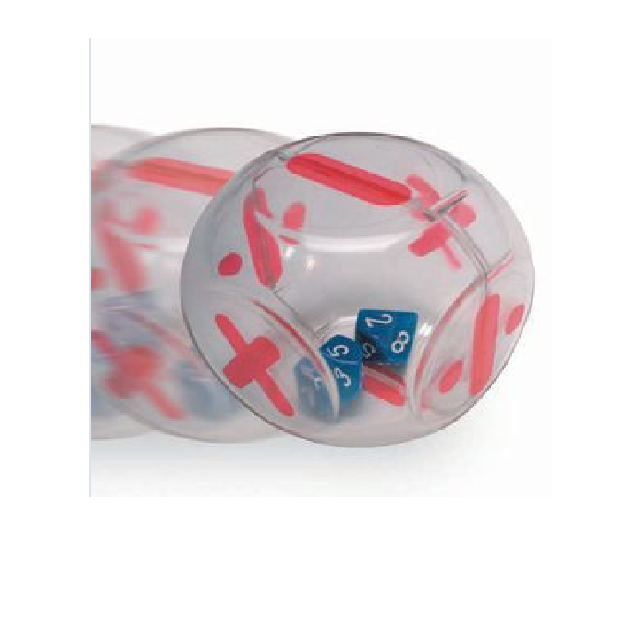 В прозрачном пластиковом кубике, на грани которого нанесены символы, находятся две малые десятигранные кости с цифрами от 0 до 9. Знаки действия оформлены в виде многоразовых наклеек, которые учитель может менять в соответствии с изучаемым материалом и возможностями своих учеников.