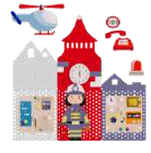 На панели изображен телефон и номер службы спасения, три башни с часами и вращающимися элементами, бизиборд «Спасатель МЧС» со светоотражающими наклейками, бегунком, тактильной поверхностью, застежками фастекс и фонариком на шлеме, а также вертолет с вращающимся пропеллером.