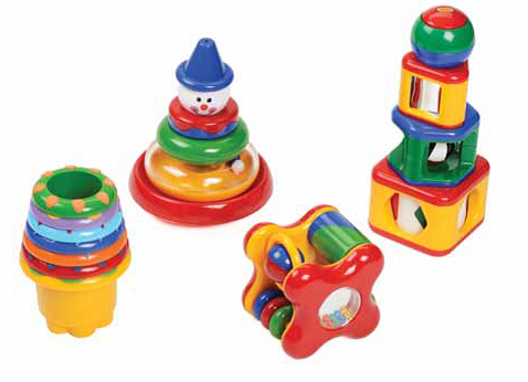 Разноцветные элементы пирамидки в виде самостоятельных игрушек ставятся друг на друга, образуя фигурку клоуна.