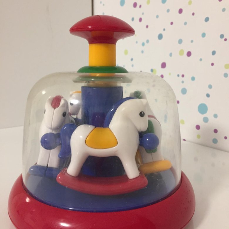 Волчок, по периметру круглой арены - платформы под прозрачным колпаком расположены пони. Волчок запускается нажатием красной клавиши сверху. При вращении лошадки издают звучание