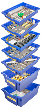 Каждый тематический набор укомплектован в отдельную пластиковую систему хранения с ложементом и пластиковой прозрачной крышкой на защелках для обеспечения наблююдения за содержимым. Штативы и скамьи имеют отдельные упаковки и обозначены необходимой информацией по принадлежности к номеру комплекта. Мобильная стойка для одновременного хранения и транспортировки всех систем хранения тематических наборов приобретается отдельно — 2.14.5. Стойки для хранения ГИА-лабораторий по физике.