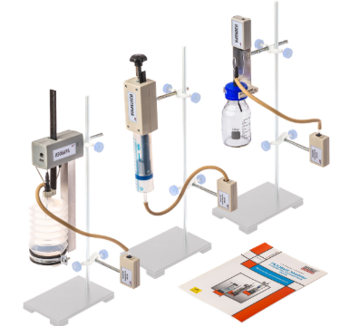 В состав набора входят три установки для осуществления изотермического, изобарного и изохорного процессов, которые имеют встроенные датчики объема и температуры, позволяющие регистрировать параметры газа в процессе изменения его состояния. Конструкция установок обеспечивает постоянство одного из параметров газа при варьировании двух других параметров. Для измерения давления газа применяется датчик абсолютного давления.