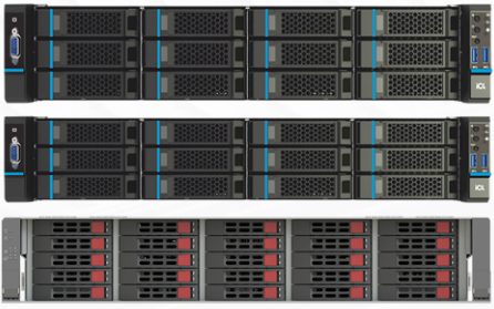 Два контроллера в корпусе высотой 2U каждый для монтажа в стойку 19” с подключаемыми дисковыми модулями JBOD