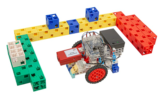 В состав комплекта входит несколько вариантов «Умной среды» для робота — это варианты полигонов, собранные из кубиков. Предполагается, что дети будут программировать робота на выполнение ряда задач для достижения цели. Сам полигон может быть любым, с различными препятствиями и задачами, при этом он тоже программируемый, но задачи по программированию полигона более сложные и могут выполняться разными способам: — более старшими детьми; — преподавателями; — преподаватель вместе с детьми может сделать урок по обновлению прошивки платы для полигона.