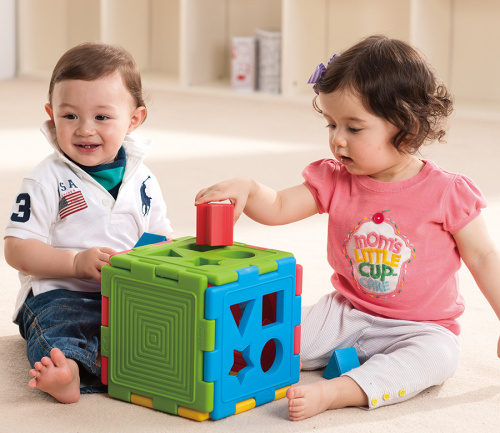 Сборный куб из панелей состоит из 3 панелей с отверстиями разной геометрической формы, 2 панелей с рельефным рисунком, 1 панели с круглым безопасным зеркалом. Для сортировки - 12 фигурок четырех форм разной высоты. Можно работать с каждой панелью отдельно, можно выложить дорожку или собрать куб.