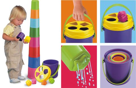 Разноцветные ведерки и формочки для песка и воды. В наборе - 10 ведерок разного размера, которые можно складывать друг в друга как матрешку или поставить одно на другое, построив высокую пирамиду. В крышке большого ведра есть отверстия для сортировки песочных формочек из набора.